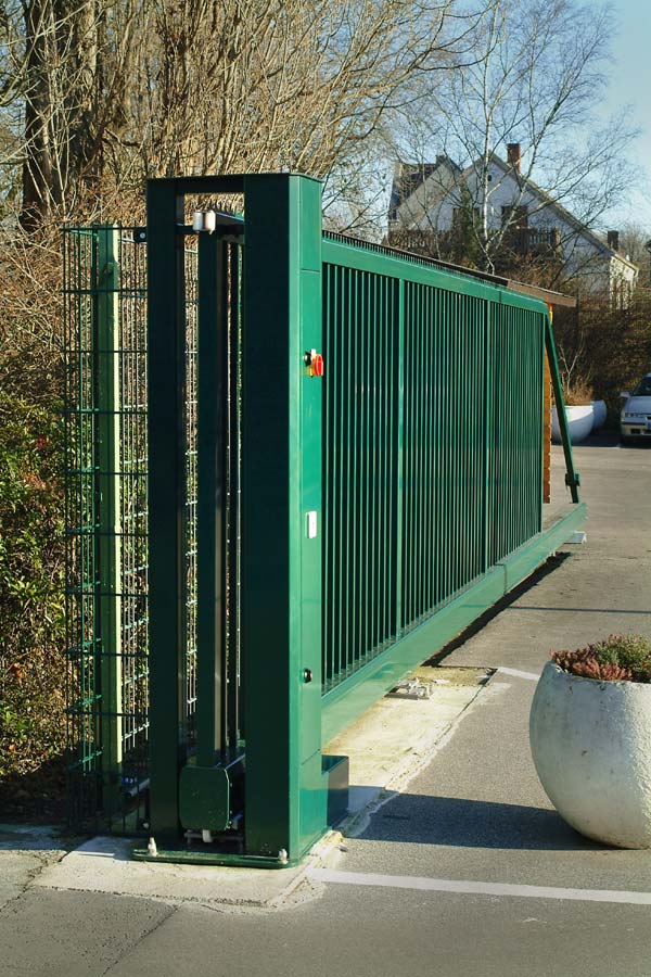 Schiebetore sind immer dort ideal einsetzbar, wo große Durchgangsbreiten schnell und sicher zu überbrücken sind. Die manuelle Grundausstattung unserer Schiebetore kann durch einen im Führungspfosten integrierten elektromechanischen Antrieb ergänzt werden.
